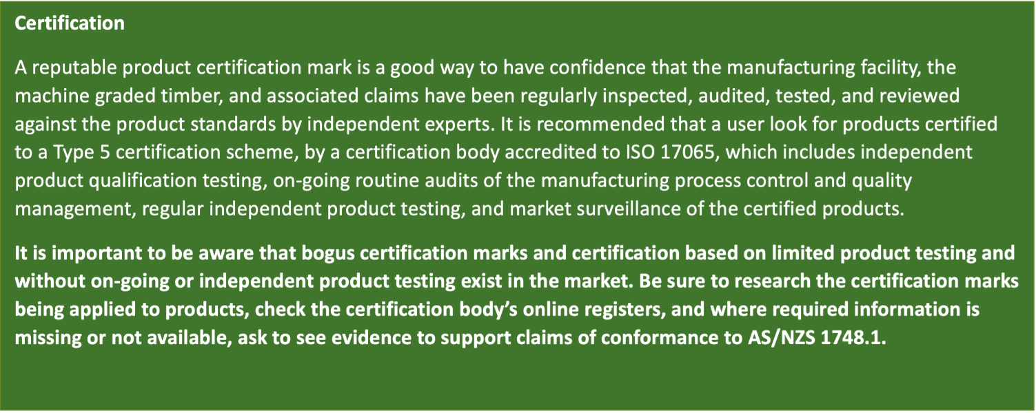 If F grades or MGP grades are sold as meeting AS/NZS1748, the best way to validate this claim is to ask for evidence of independent, third-party certification. If the supplier is certified, ask where this certification can be confirmed.