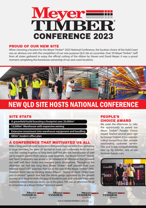 Meyer Timber key staff enjoyed their National Conference in January this year in Broad Beach QLD. The feature event of the weekend was the grand opening of the new Meyer Timber QLD purpose built facility at Luscombe boosting a 20,000m2 footprint. The day involved a food truck festivities and a relaxed atmosphere that had long term Meyer Timber staff share stories and presentations capturing the History of Meyer Timber. The Meyer family commitment to industry now spans the entire east coast with warehousing and staff across all major state cities.
